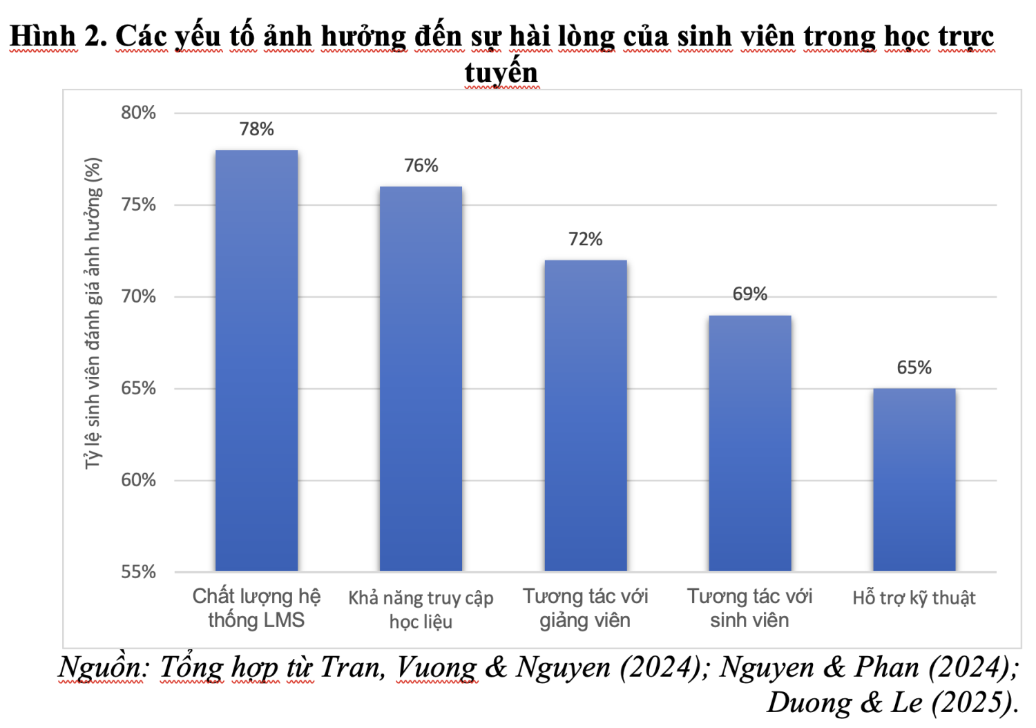 Ngoài ra, chất lượng của hệ thống học tập trực tuyến cũng được xác định là yếu tố quan trọng ảnh hưởng đến trải nghiệm học tập của sinh viên. Nghiên cứu của Nguyen và Phan (2024)13 cho thấy, các yếu tố như tính dễ sử dụng và tính hữu ích của hệ thống LMS có ảnh hưởng tích cực đến sự hài lòng của sinh viên. Khi sinh viên đánh giá cao chất lượng của hệ thống học tập số, họ có xu hướng tham gia tích cực hơn vào các hoạt động học tập và duy trì động lực học tập trong thời gian dài hơn.
