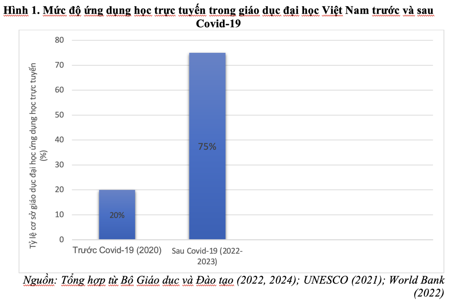Những thay đổi này đã tạo ra sự khác biệt đáng kể trong mức độ ứng dụng học tập trực tuyến trong các cơ sở giáo dục đại học tại Việt Nam trước và sau đại dịch. Trước năm 2020, việc triển khai học trực tuyến chủ yếu mang tính hỗ trợ cho phương thức đào tạo truyền thống và chưa được áp dụng rộng rãi. Tuy nhiên, sau đại dịch, nhiều cơ sở giáo dục đã tích hợp các nền tảng học tập số vào chương trình đào tạo, qua đó làm tăng đáng kể mức độ ứng dụng công nghệ trong giảng dạy.