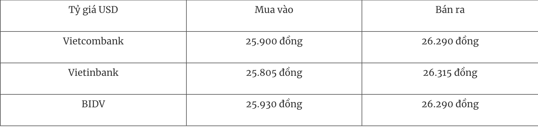 Tỷ giá USD tại một số ngân hàng thương mại mua vào và bán ra như sau: