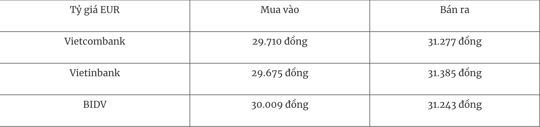 Tỷ giá EUR tại một số ngân hàng thương mại mua vào và bán ra như sau: