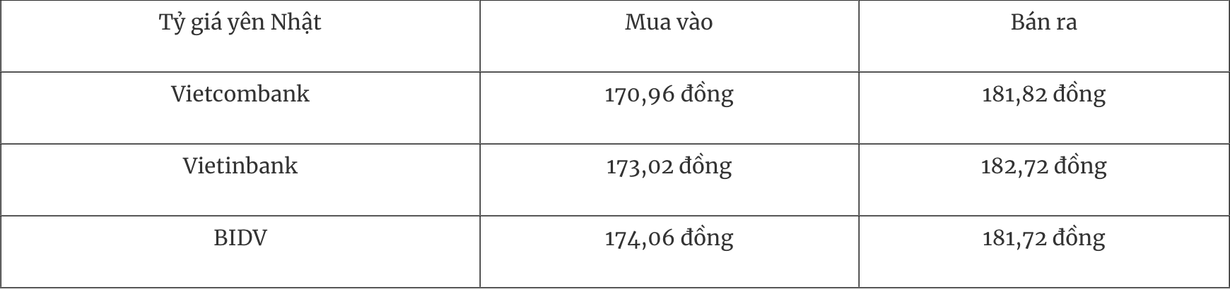 Tỷ giá YEN tại một số ngân hàng thương mại mua vào và bán ra như sau: