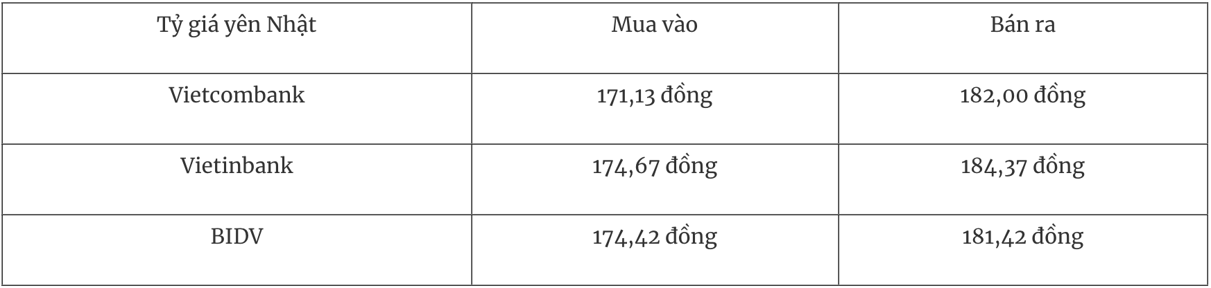 Tỷ giá YEN tại một số ngân hàng thương mại mua vào và bán ra như sau:
